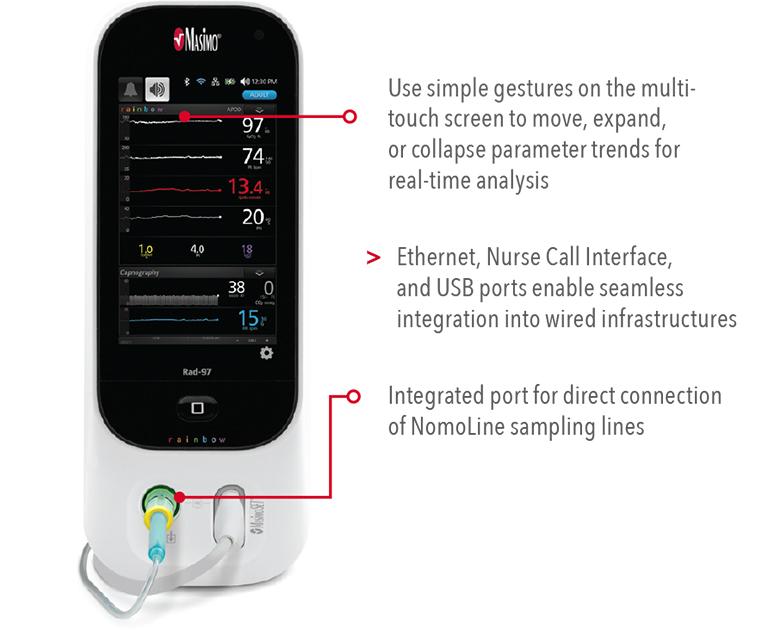 Rad-97集成NomoLine二氧化碳监测仪,在一个紧凑、独立的设备中提供持续的氧合和通气监测,为临床医生提供一个单一显示器上更完整的患者呼吸状态图片。